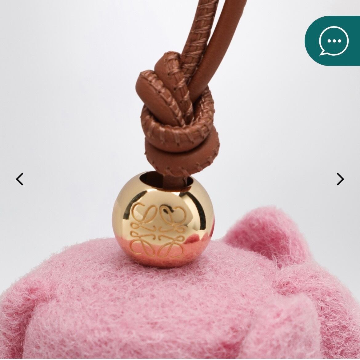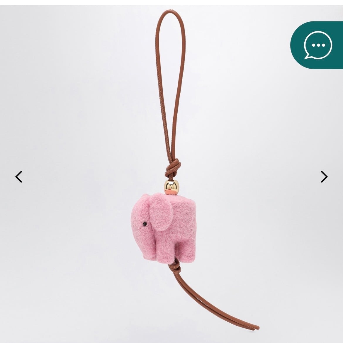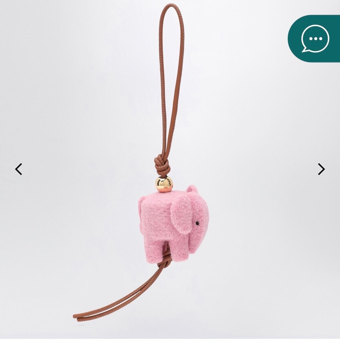ピンクのフェルトで象の形をデザインしたロエベのペンダント。カーフスキンレザーのチューブ状の ループストラップとゴールドのアナグラムペブルのディテールが施されています。