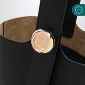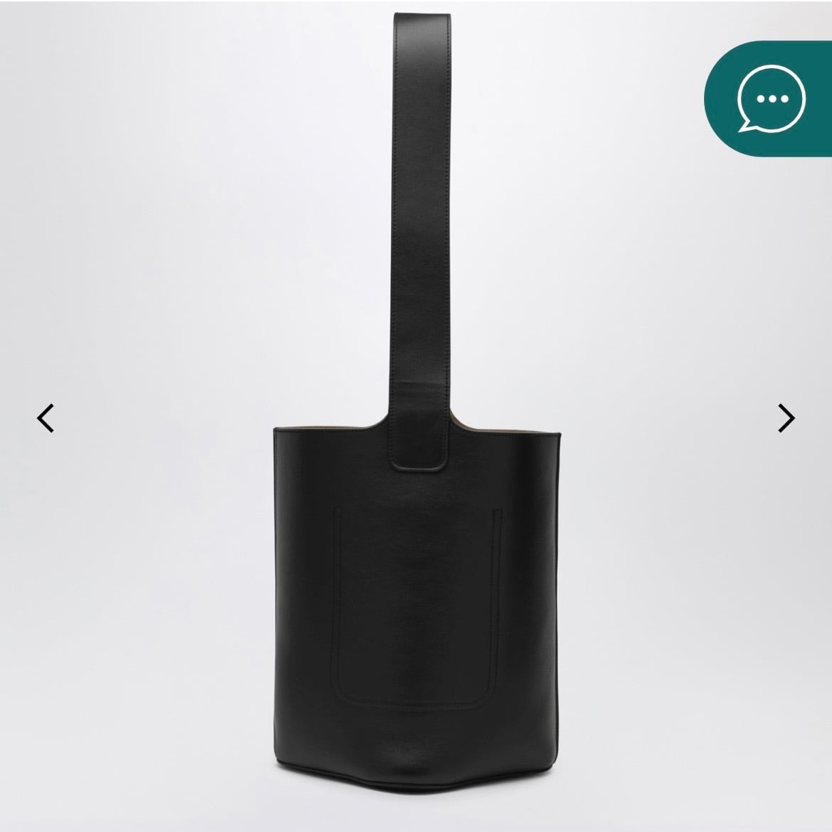 ロエベのブラックカーフスキンレザー製ミディアムバケットバッグ。マグネット 開閉式、ゴールドトーンのボタンで調節可能なショルダーストラップ、アナグラム ロゴが刻印された内側のフラットポケット、ゴールドトーンのメタル 金具が特徴です。