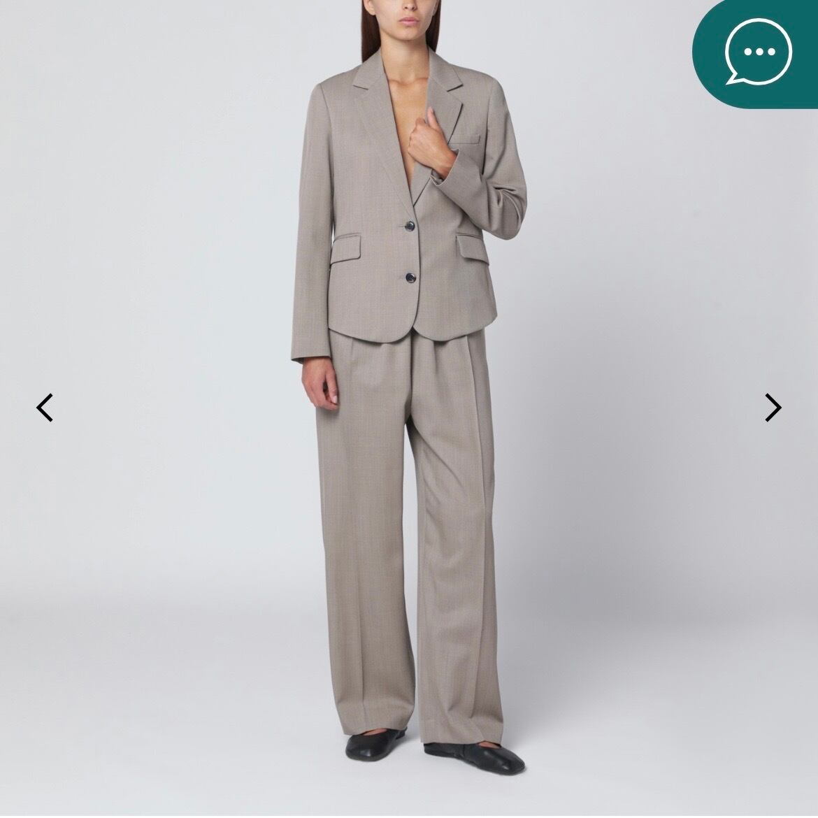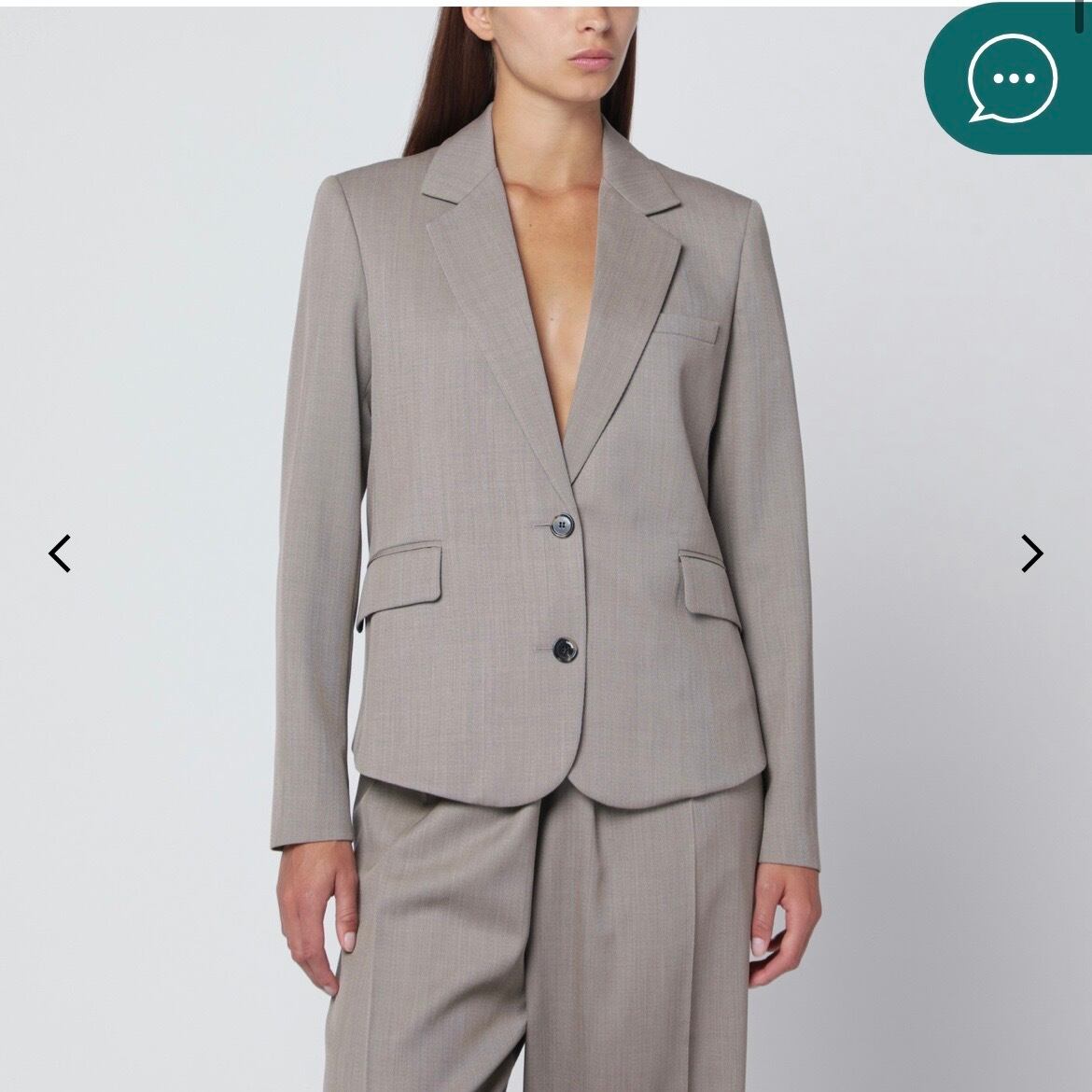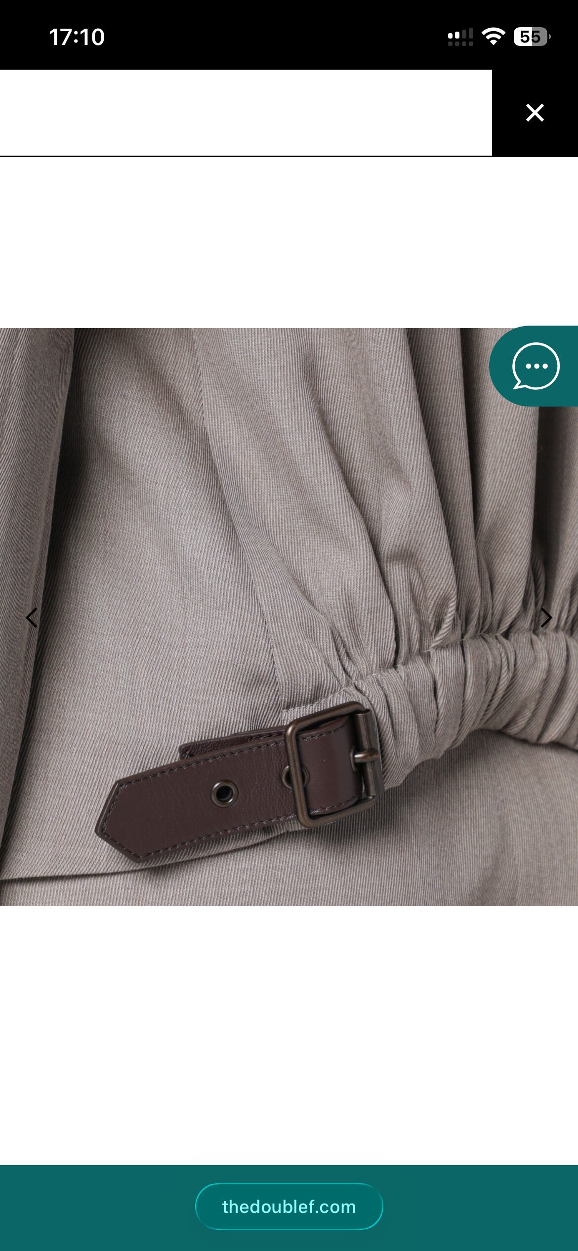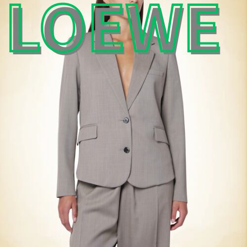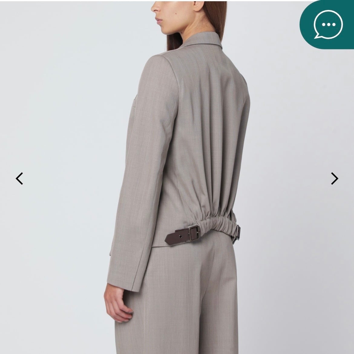 クラシカルなラペル、胸にウェルトポケット1つ、フロントにフラップポケット2つ、袖口にスリットの入ったロングスリーブ、レザーベルト付き後ろ裾のギャザー、フロントボタンクロージャーが特徴です。
