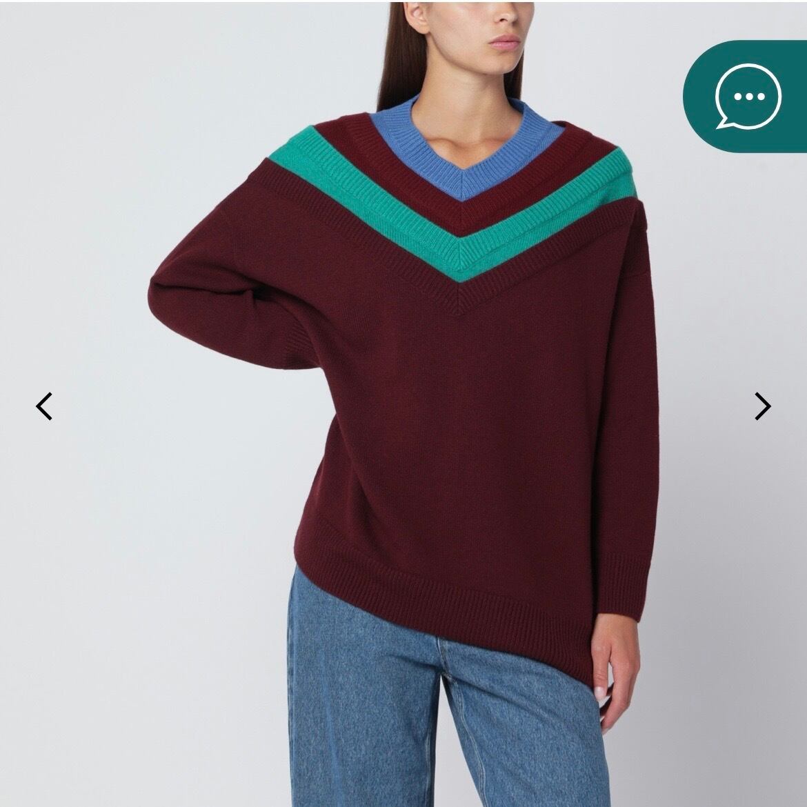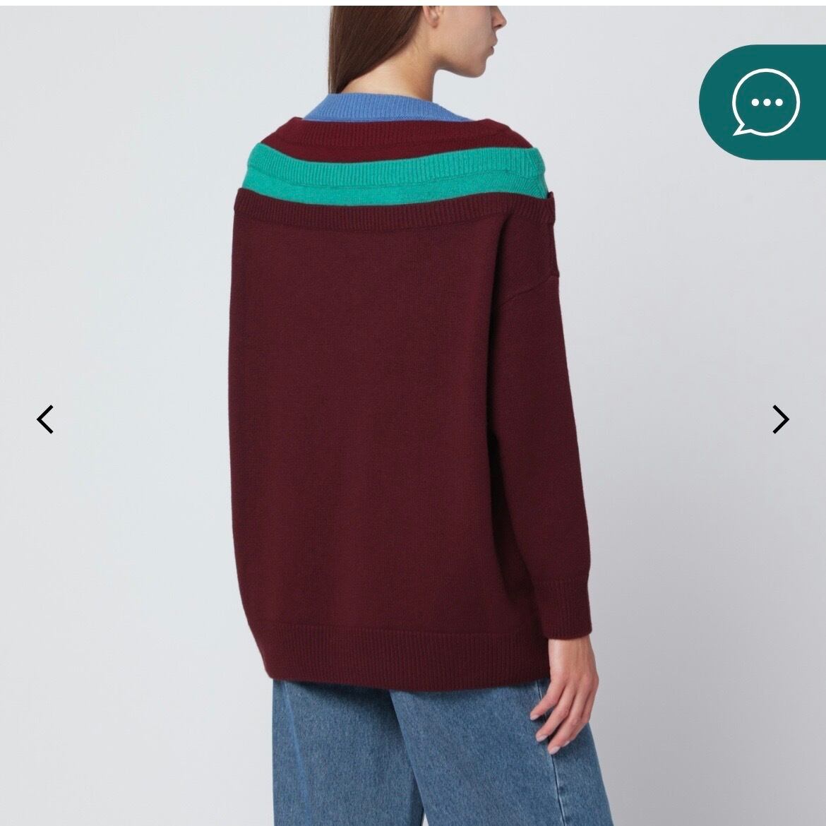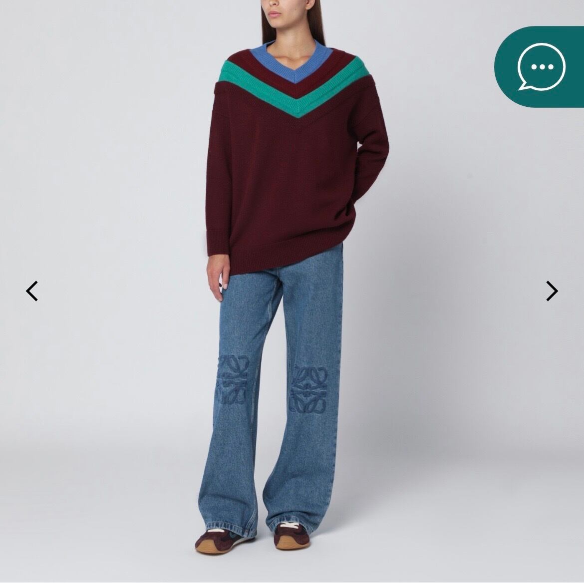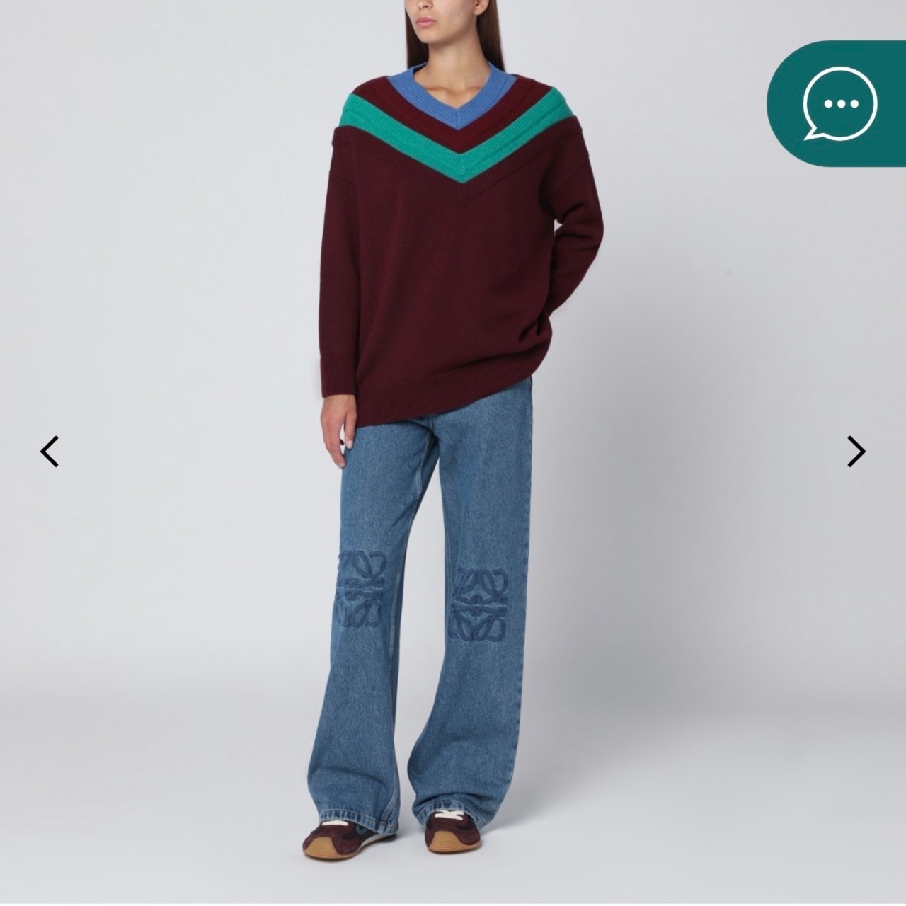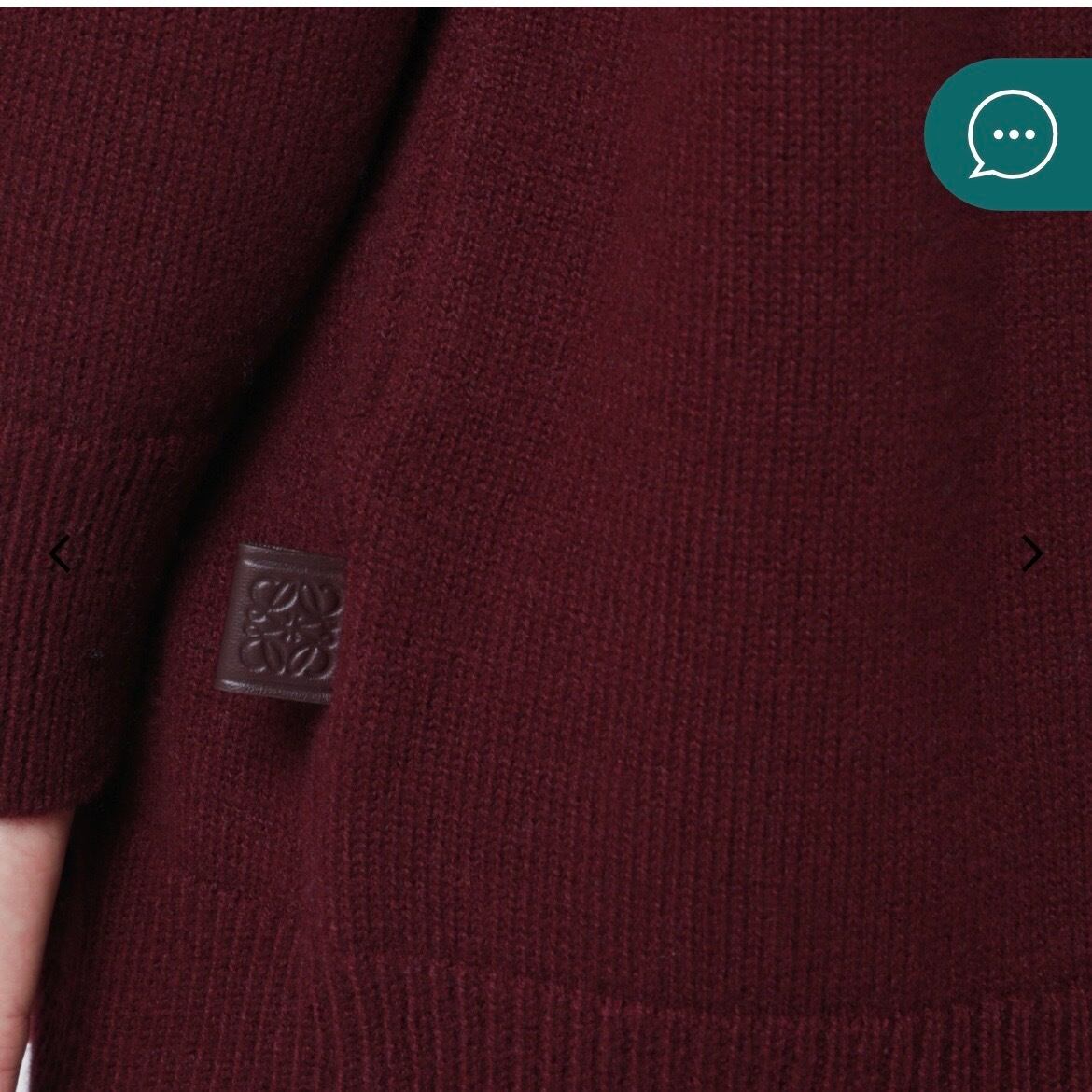 ロングスリーブ、だまし絵のようなレイヤー構造、Vネック、リブ編みトリム、サイドにアナグラムモチーフのエンボス加工を施したレザータブ、ロング丈が特徴です。